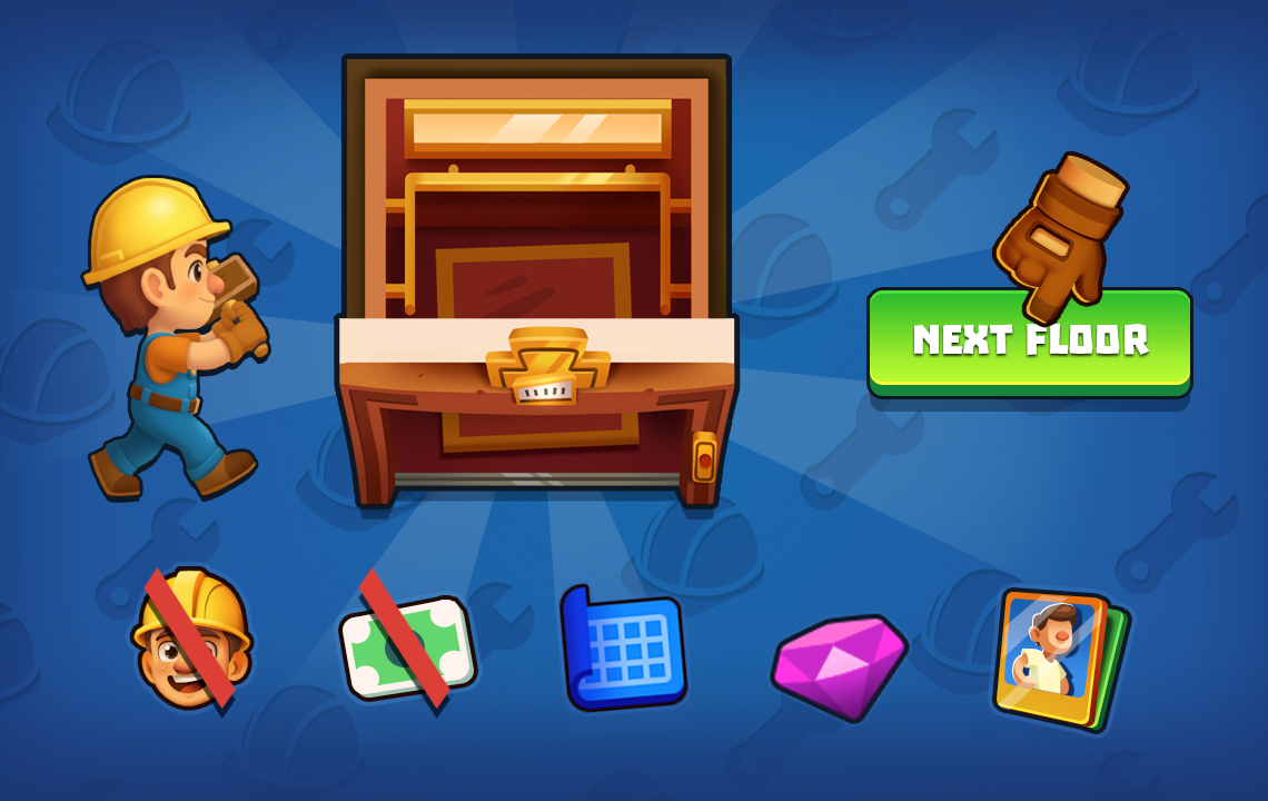 When you start a new floor, the journey begins fresh. Your workers and cash reset, so you begin the challenge from the start. At the same time, your blueprints, permanent boosters, gems, and cards stay with you. These permanent resources improve over time, helping you advance more smoothly on each new floor