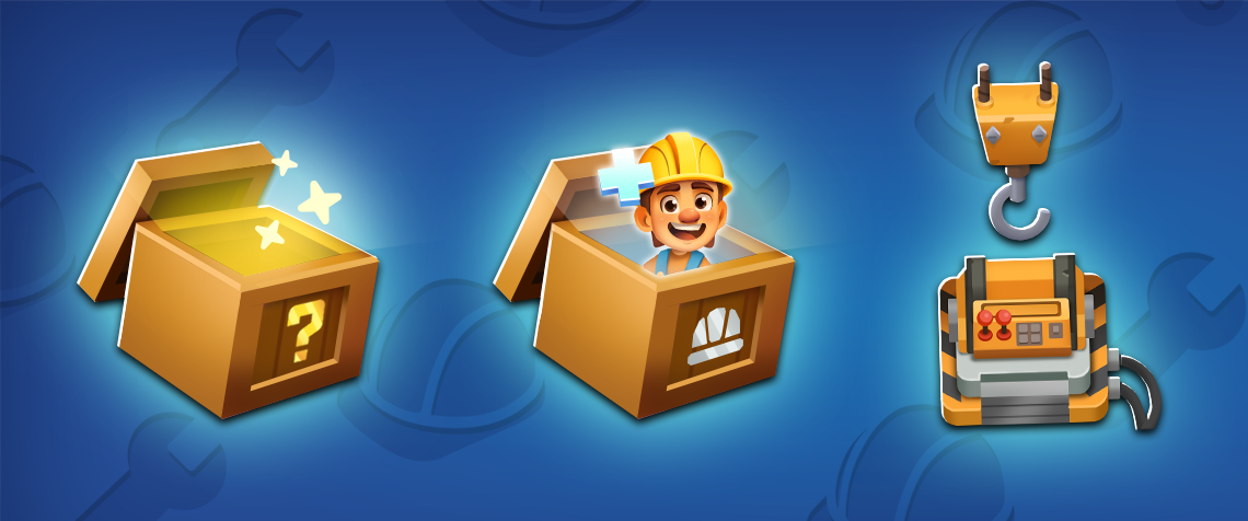 The crane increases your workforce! The timer above the crane operator indicates the time remaining to get a new worker. The crane also periodically delivers mystery boxes, which can contain resources, including new workers! These mystery boxes appear in front of the workbench from time to time.