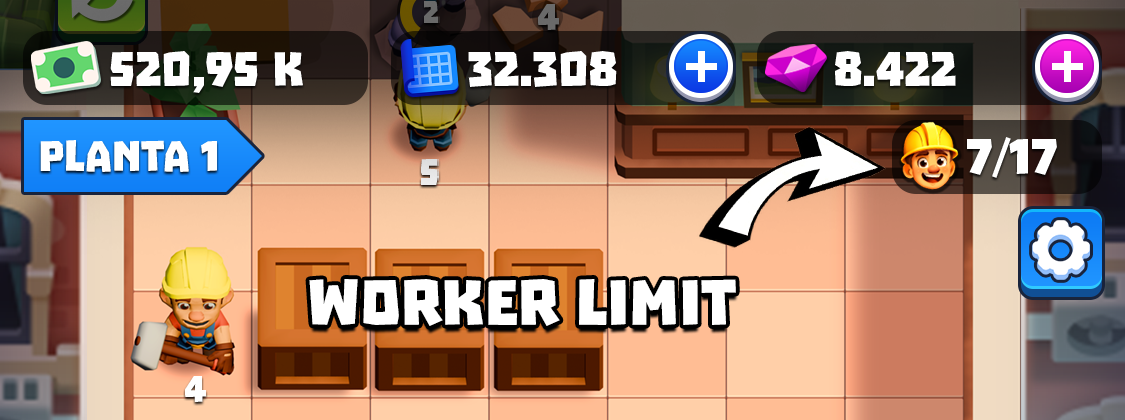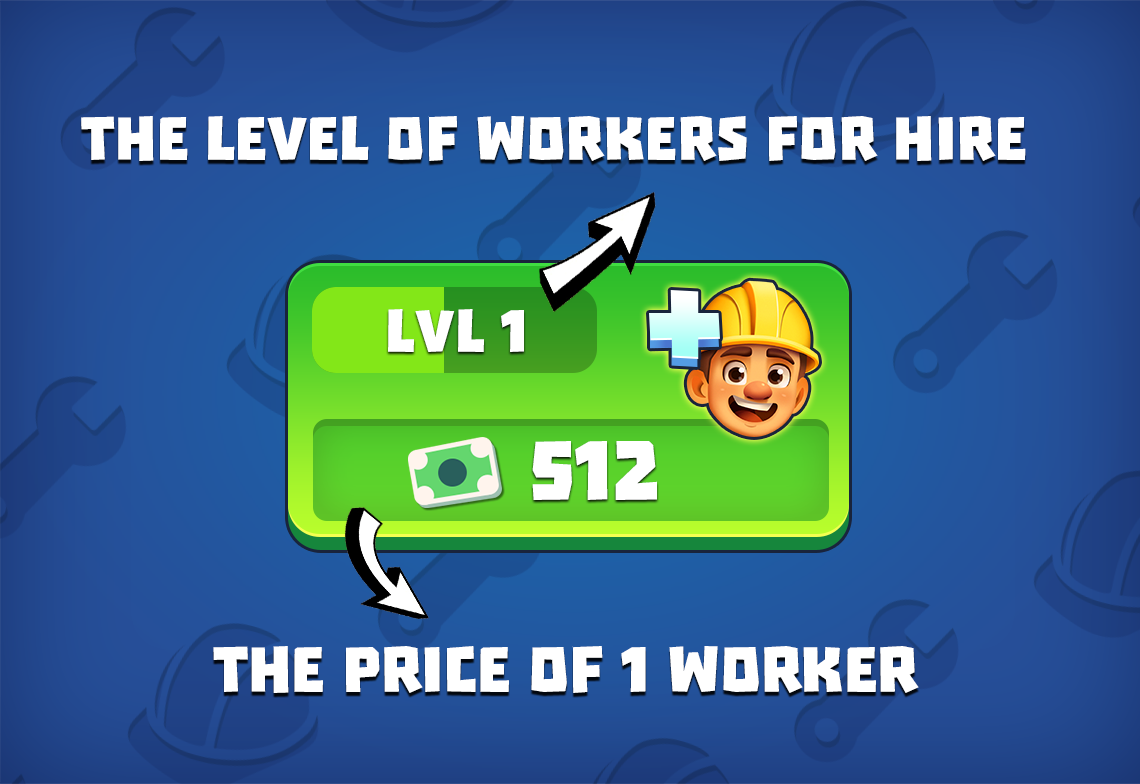 Don't forget that the main way to hire workers is by spending some cash to hire a worker using the button at the bottom of the screen. The button also shows the current level of workers you can hire and the cost for one.