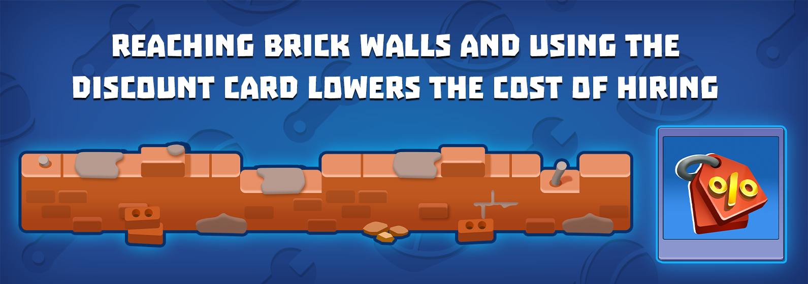 Every time you find a brick wall, the hiring price will be reduced. Don't forget to check the cards section to find a permanent discount for your workers, too!