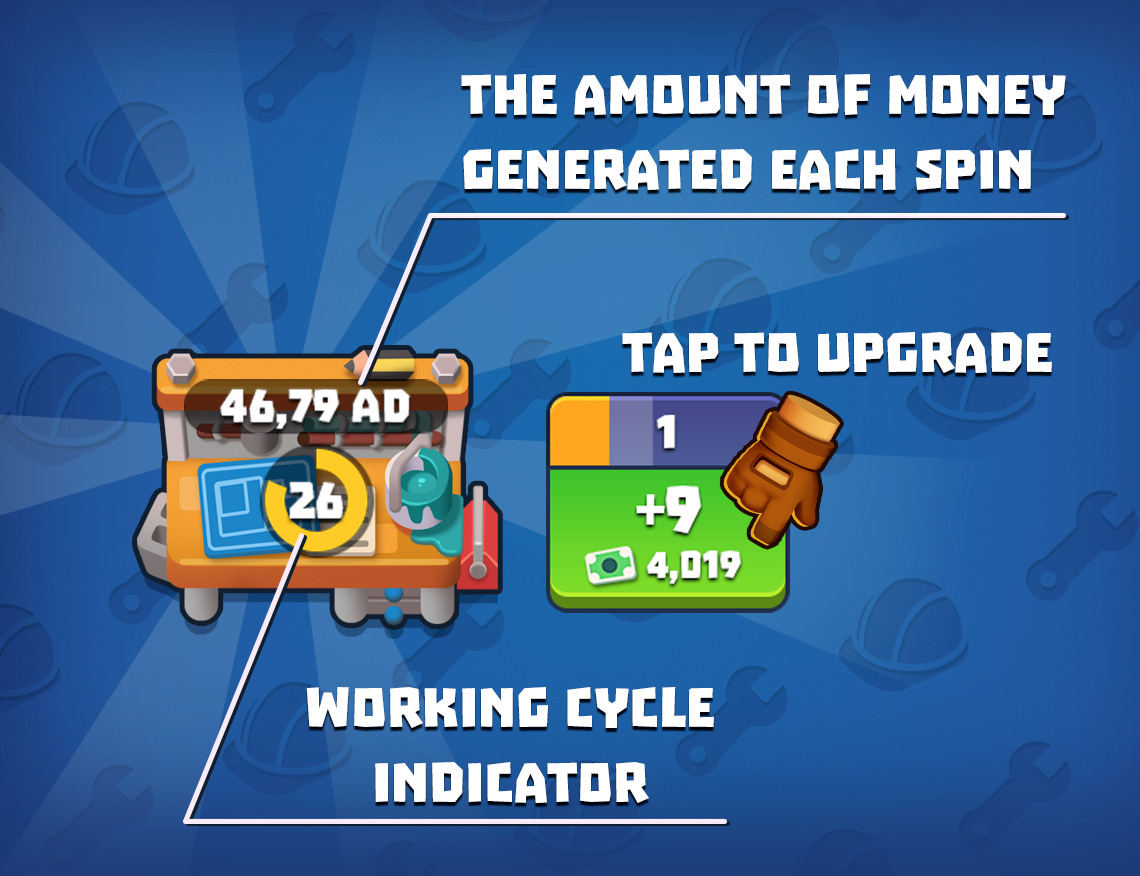 You can spend cash to upgrade the workbench and increase how much cash it produces. To do that, tap the green button near the workbench. If the button is greyed out, it means you don’t have enough cash at the moment.